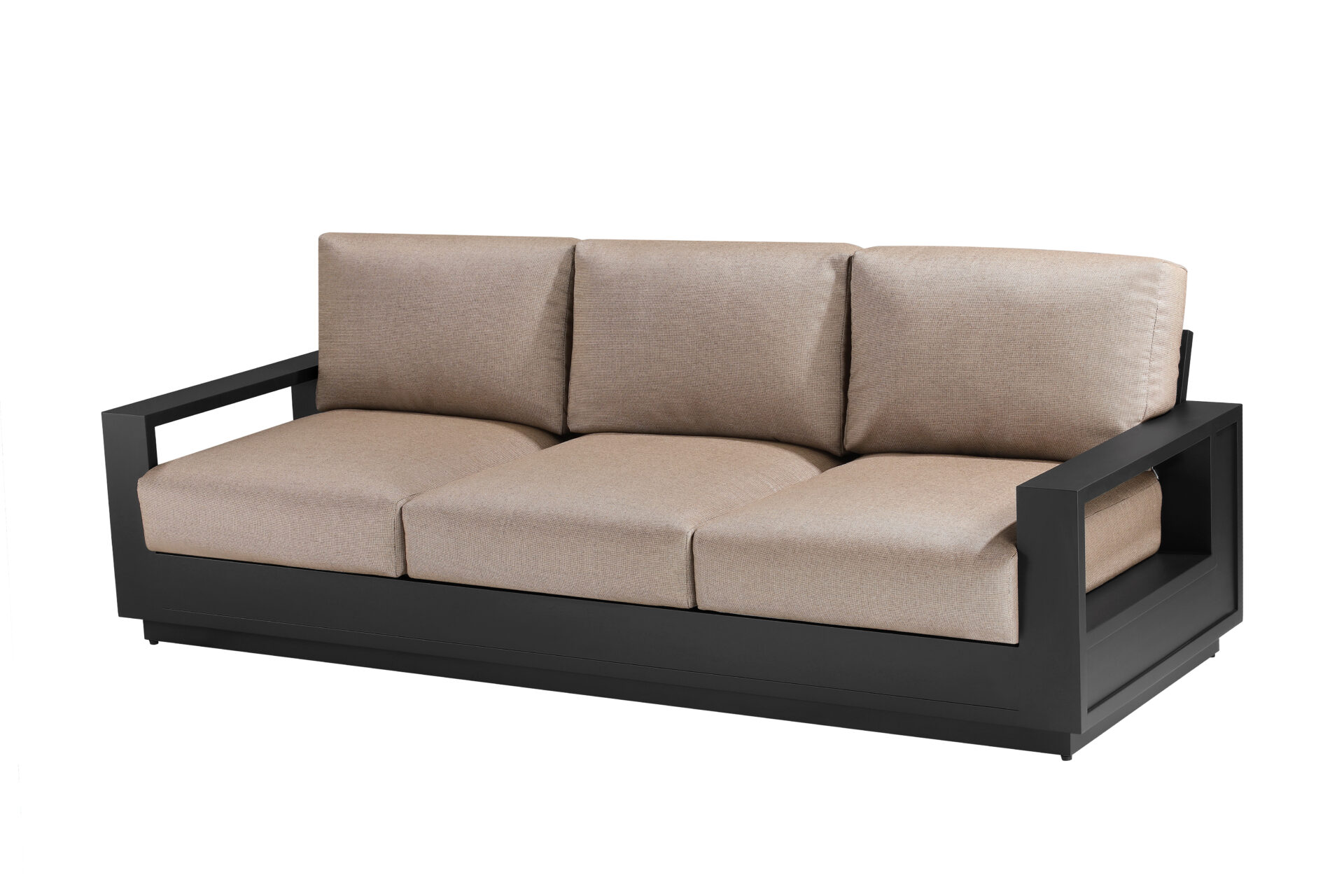 Generously sized cushions are upholstered in premium performance outdoor acrylic fabric—Sunbrella®—designed to resist fading, mildew, and everyday wear. Deep seating and supportive cushioning create a relaxed, lounge-worthy feel perfect for patios, poolside spaces, or contemporary backyard settings.