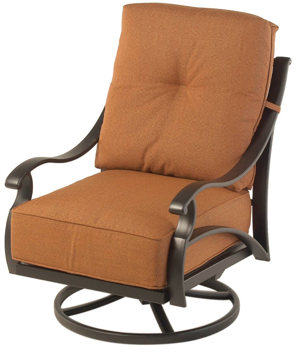 This Hanamint Somerset swivel lounge chair is stocked in Terra Mist finish and Sunbrella Cast Slate (A) fabric.